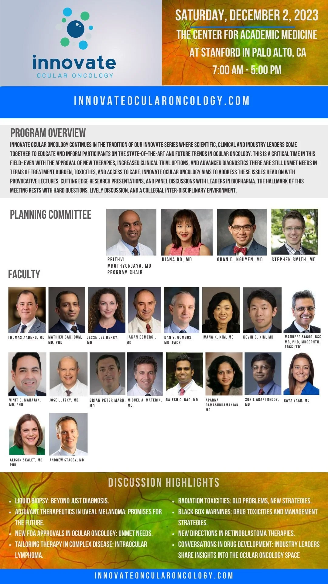INNOVATE Ocular Oncology continues in the tradition of our INNOVATE series, where scientific, clinical, and industry leaders come together to educate and inform participants on the state-of-the-art and future trends in ocular oncology. This is a critical time in this field- even with the approval of new therapies, increased clinical trial options, and advanced diagnostics, there are still unmet needs regarding treatment burden, toxicities, and access to care. INNOVATE Ocular Oncology aims to address these issues head-on with provocative lectures, cutting-edge research presentations, and panel discussions with leaders in biopharma. The hallmark of this meeting rests with hard questions, lively debate, and a collegial inter-disciplinary environment.